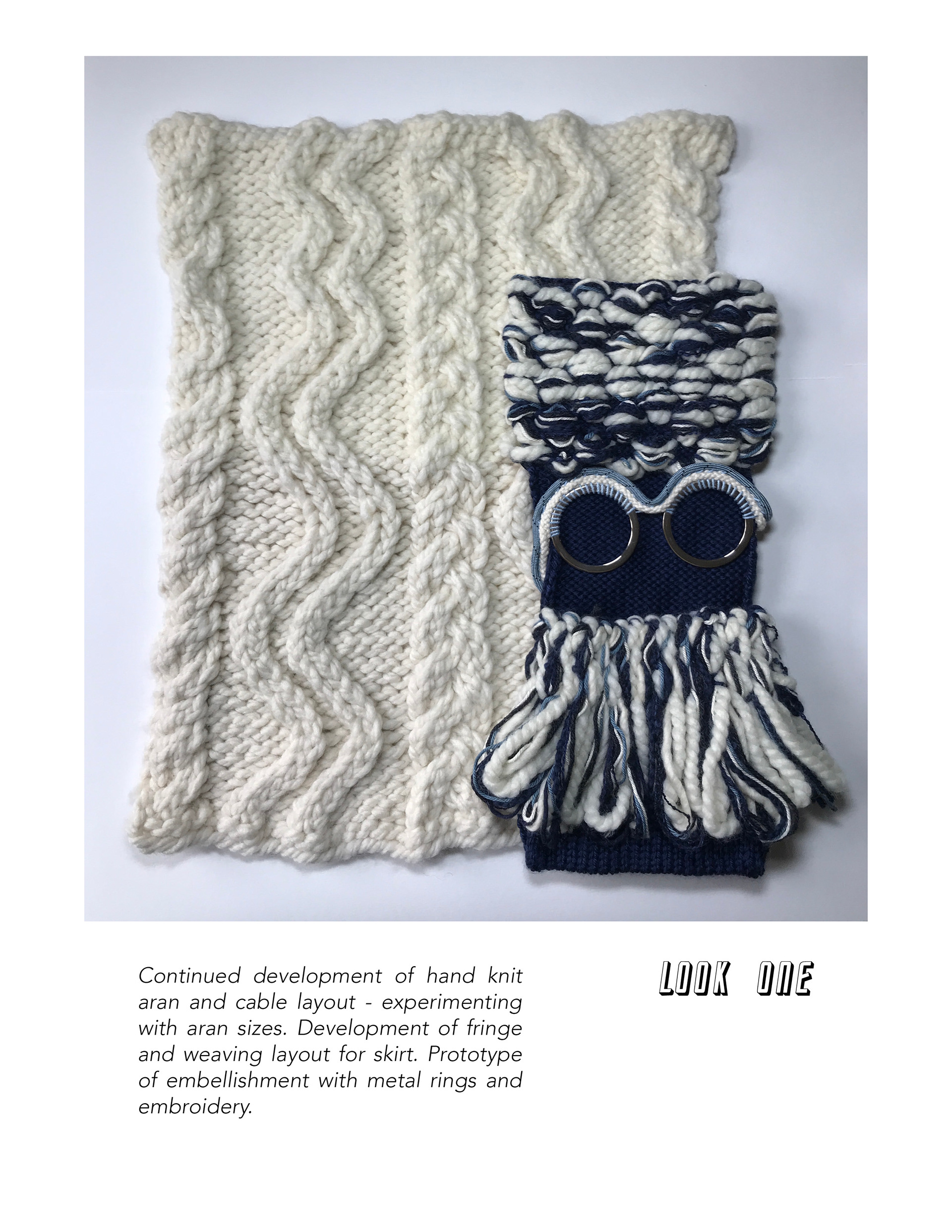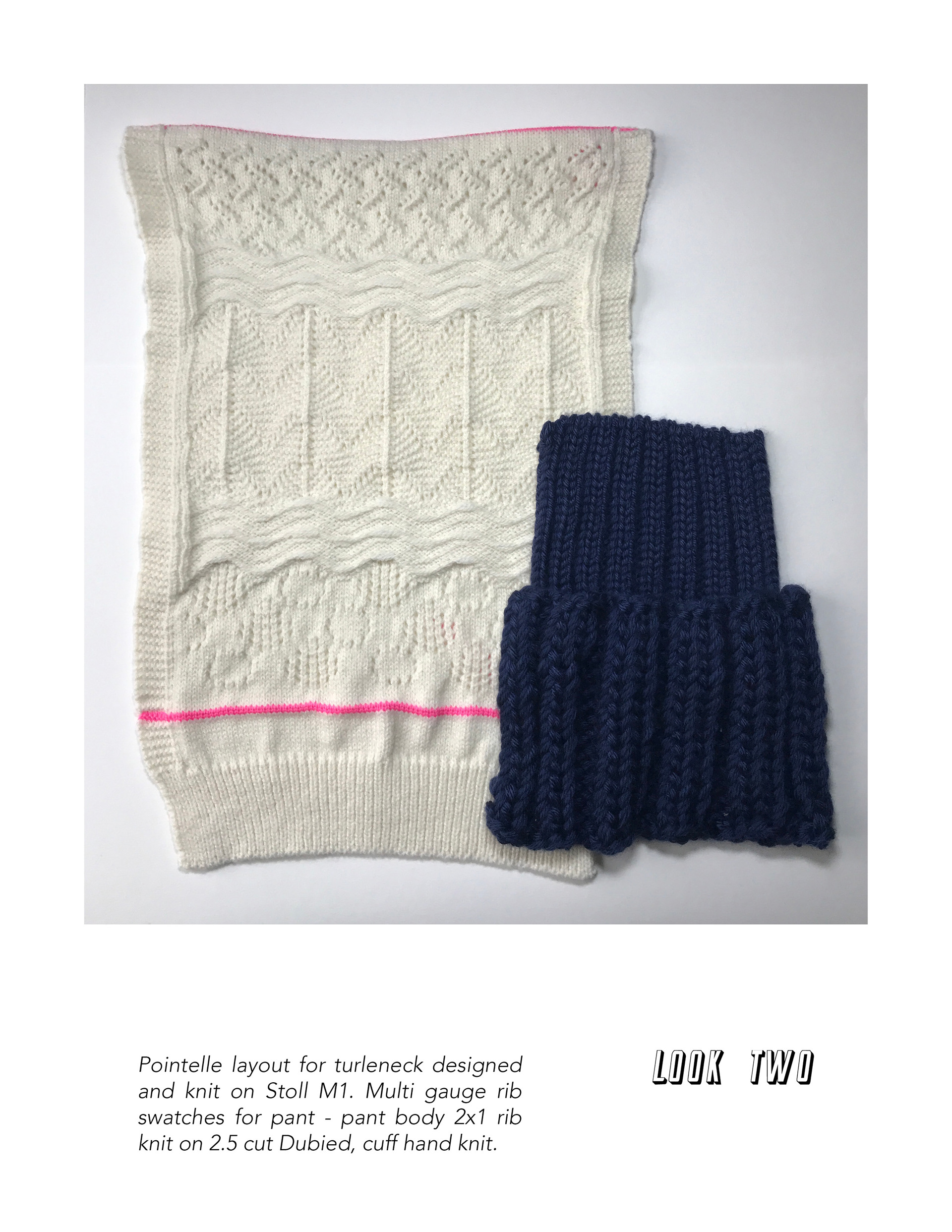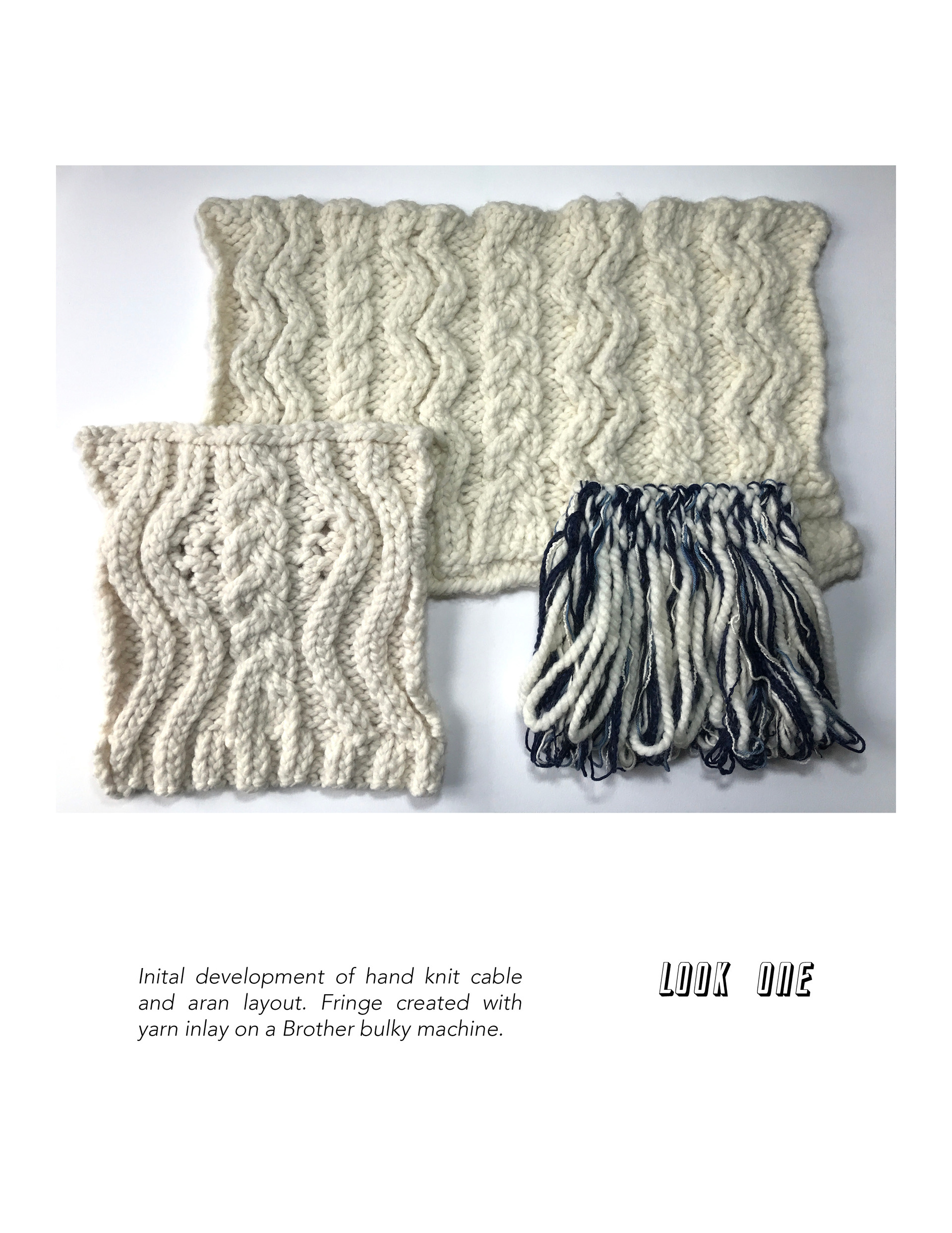 Knit textile development for FIT BFA Senior Thesis Collection. Includes hand knit, hand manipulated machine knit, and fully automated machine knit development.